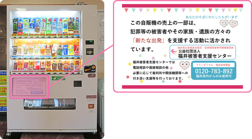 自動販売機での売り上げの一部を、福井被害者支援センターにご寄付していただくシステムです。